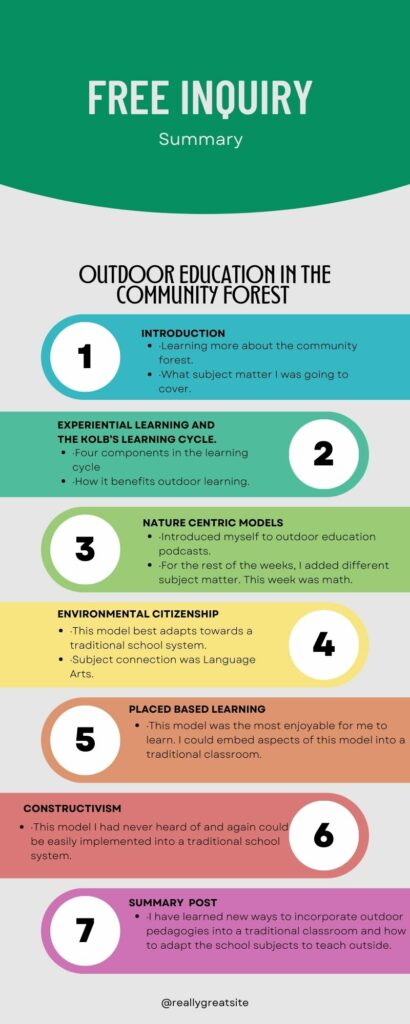• This project added my learning so much. I broadened my perspective on outdoor education and the locations you can take them too. In can be an outdoor playground, the school field, or a recreational area like the community forest to integrate outdoor education into everyday schoolwork.