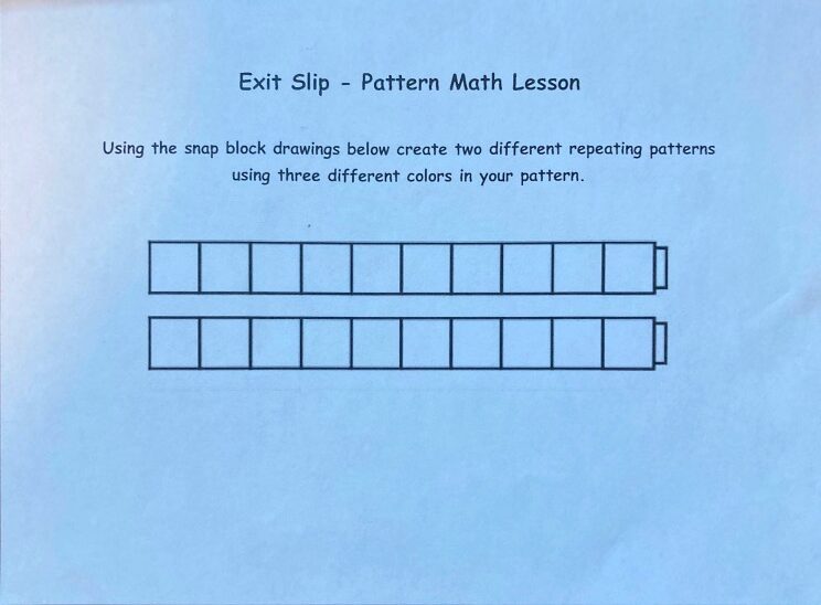 After working for ten minutes on the second page of the worksheet. Ashlyn directed the studentsâ attention to her, and we moved on to the exit slip for the lesson. The exit slip had two pictures of snap cubes and the students needed to color in a pattern they learned from the lesson. For example, a pattern they could have used was a red and blue (ABAB) repeating pattern. The students then got an exit slip to demonstrate their learning.