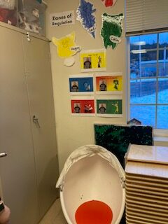 In the classroom, there is a zone of regulation. This zone was in the left back corner of the classroom by the teacherâs desk. The window was looking out the playground. I thought this was a great place in the classroom because it did not distract the other students learning and the student in the zone would be seen by the teacher when needed. This would help the student refocus when needed in the classroom. The zone of regulation is open to all students in the class, the students can go to it when they need time to refocus when they are having big emotions or are becoming dysregulated. If needed the teacher or the educational assistant would prompt the student to go to the corner if they noticed the student is about to have a big emotion and they need to calm down. I never saw a child be directed to the zone of regulation, but I did see students go there naturally when they knew they needed to calm down or be alone for a minute to refocus.